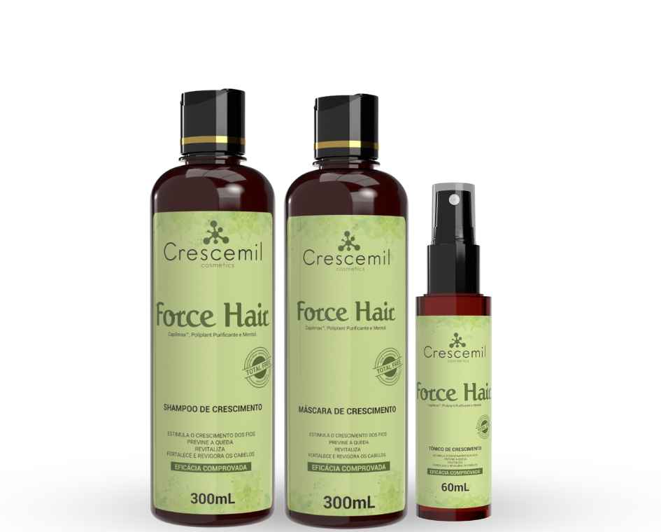 O Kit Force Hair Crescemil Cosmetics é um tratamento dermocapilar desenvolvido para estimular o crescimento saudável dos fios, fortalecer a fibra capilar e auxiliar na prevenção da queda.